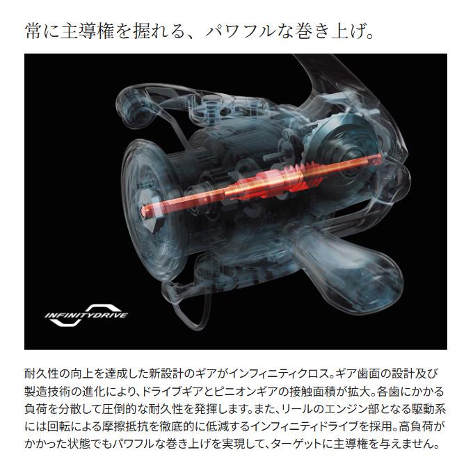 INFINITY XROSS is a technology that increases the contact area between the drive gear and pinion gear through advancements in gear tooth surface design and manufacturing technology. By distributing the load applied to the gear tooth surface over a wider area, this technology prevents the gears from sustaining concentrated damage and breaking. As a result, the durability of the gears is approximately doubled compared to traditional Shimano gears.